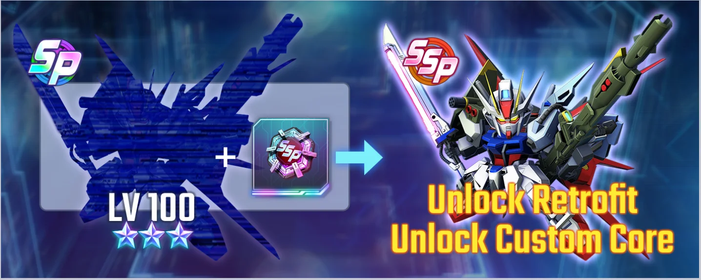 SSP Conversion will allow players to use SSP Conversion Chips on Units which have already undergone SP Conversion to level them up to LV 100 along with Limit Break.Retrofit Levels and Custom Cores will be unlocked for Units that have been SSP converted.