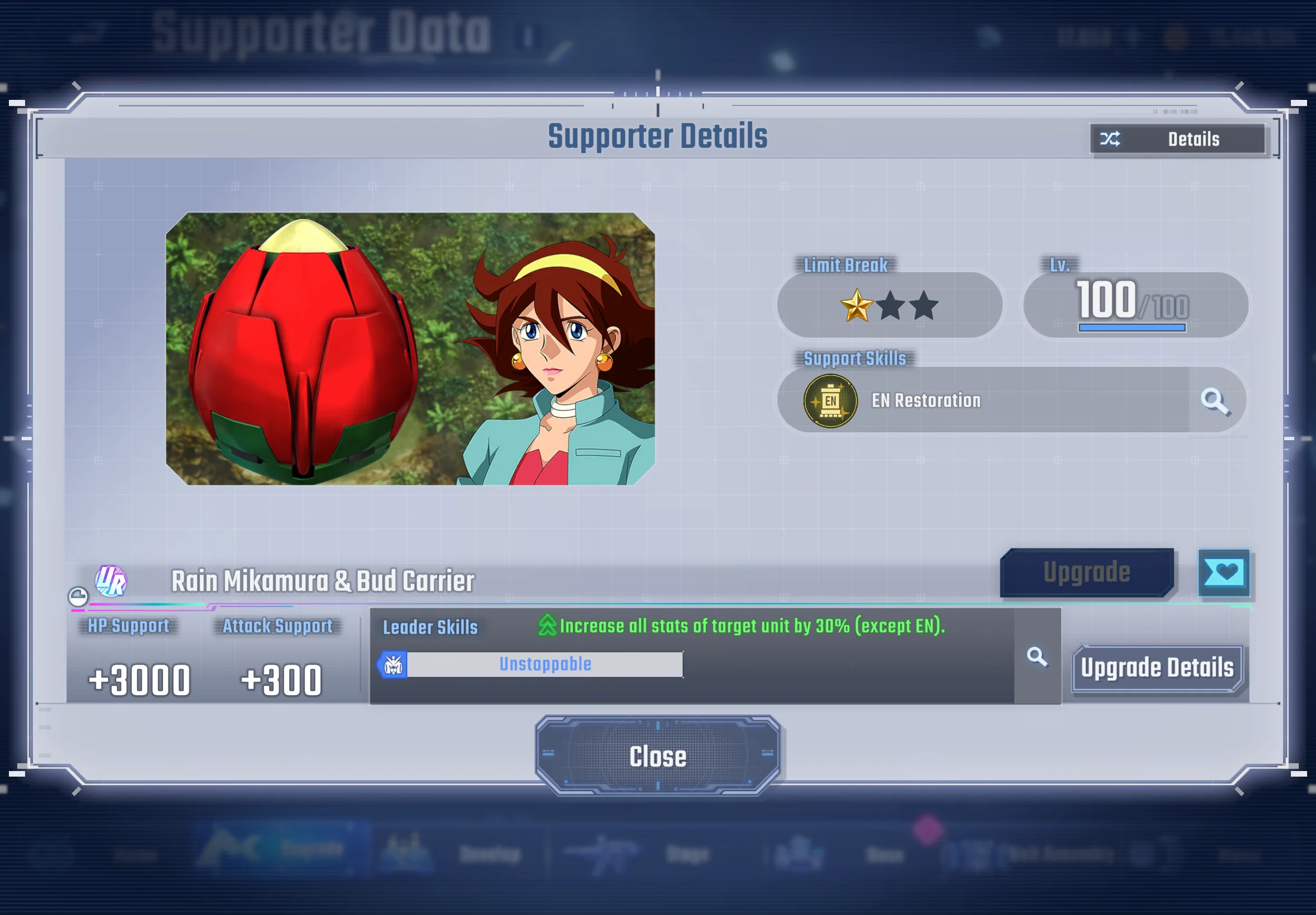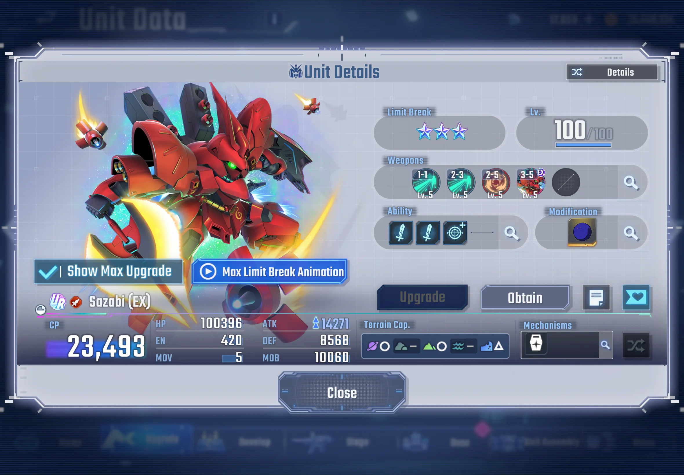 | | Has a MAP-type weapon, making it great for applying wide-area pressure. Applies a debuff that makes enemies take increased damage from Beam weapons, which fits perfectly into Beam-focused teams. Comes with EN regeneration, allowing it to keep using high-cost weapons without running dry. Includes an ability that reduces incoming Physical damage, helping it stay alive in longer battles. Has the “One-Shot Killer” tag, giving it strong team synergy and solid long-term value.